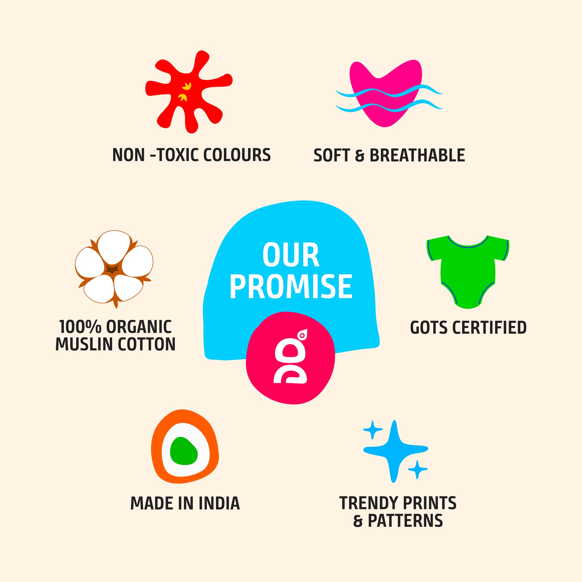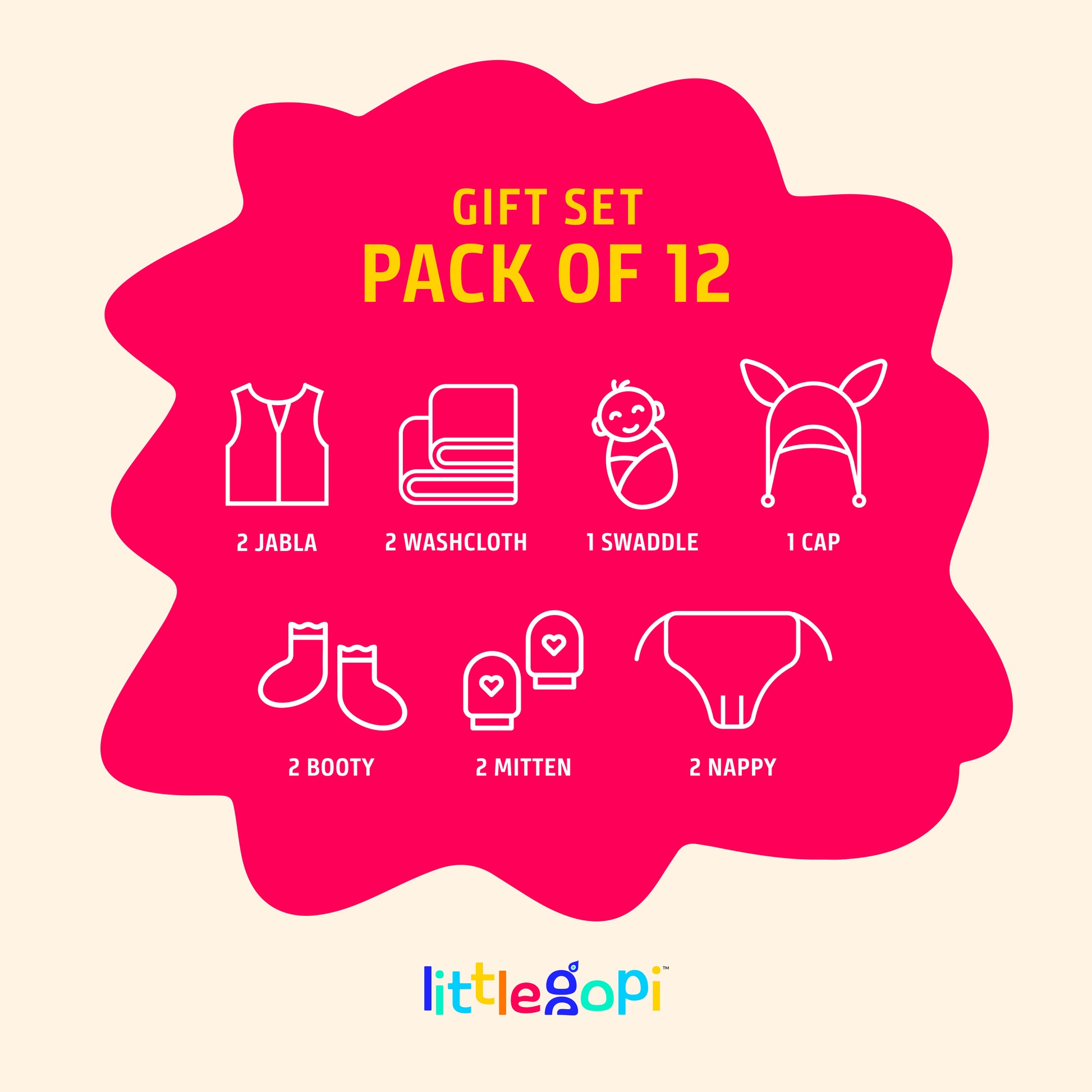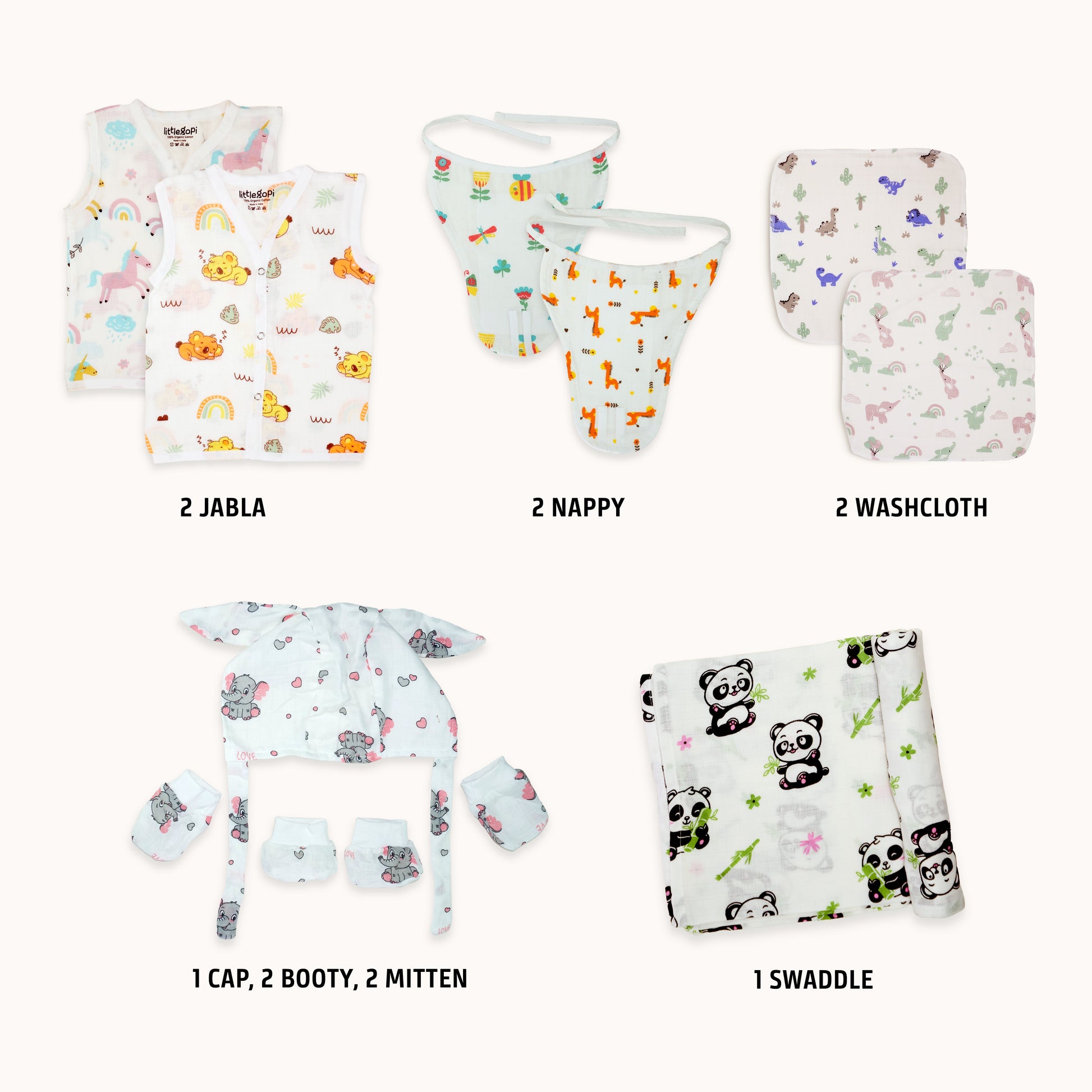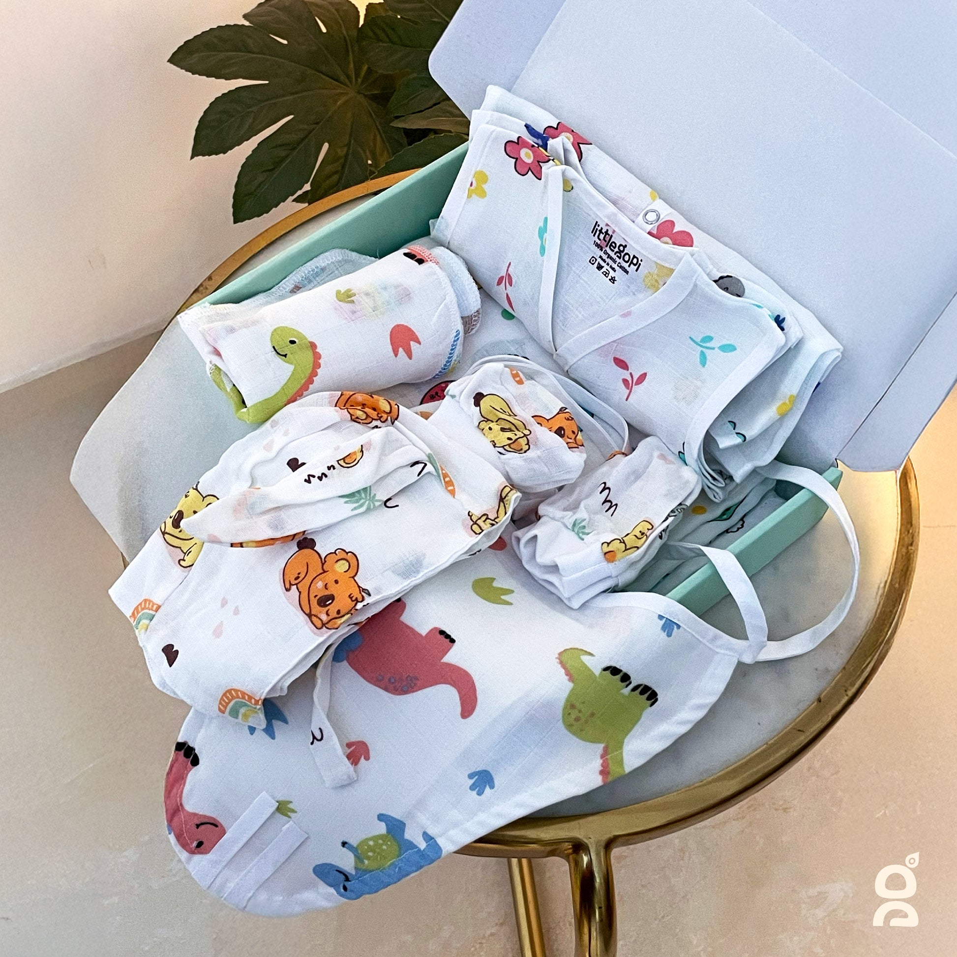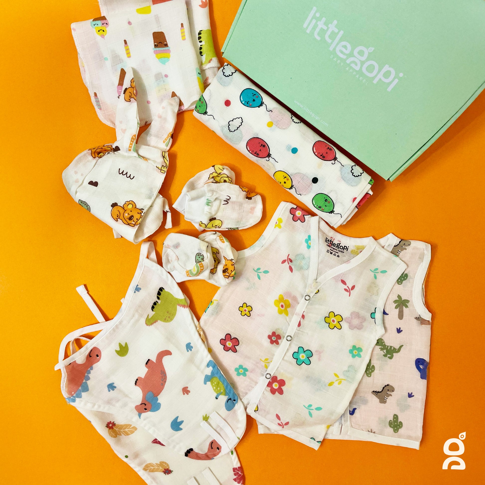 GIFT SET CONTENTS: Complete baby essentials pack featuring adorable printed 2 Muslin Jablas, 1 Cap, 2 Mitten, 2 Booties, 2 Nappy, 1 Swaddle and 2 Washcloth. PREMIUM MATERIAL: Made from high-quality GOTS certified muslin cotton fabric that is gentle on baby's delicate skin, ensuring comfort and breathability throughout the day. THOUGHTFUL DESIGN: Easy-to-use snap closures and practical V-neck openings make dressing and changing convenient for parents. VERSATILE PRINTS: Adorable collection of gender-neutral patterns featuring playful dinosaurs, cheerful balloons, and sweet floral designs in soft, pleasant colours. PACKAGING: Beautifully presented in a signature mint-coloured Little Gopi gift box, making it perfect for baby showers and newborn presents.